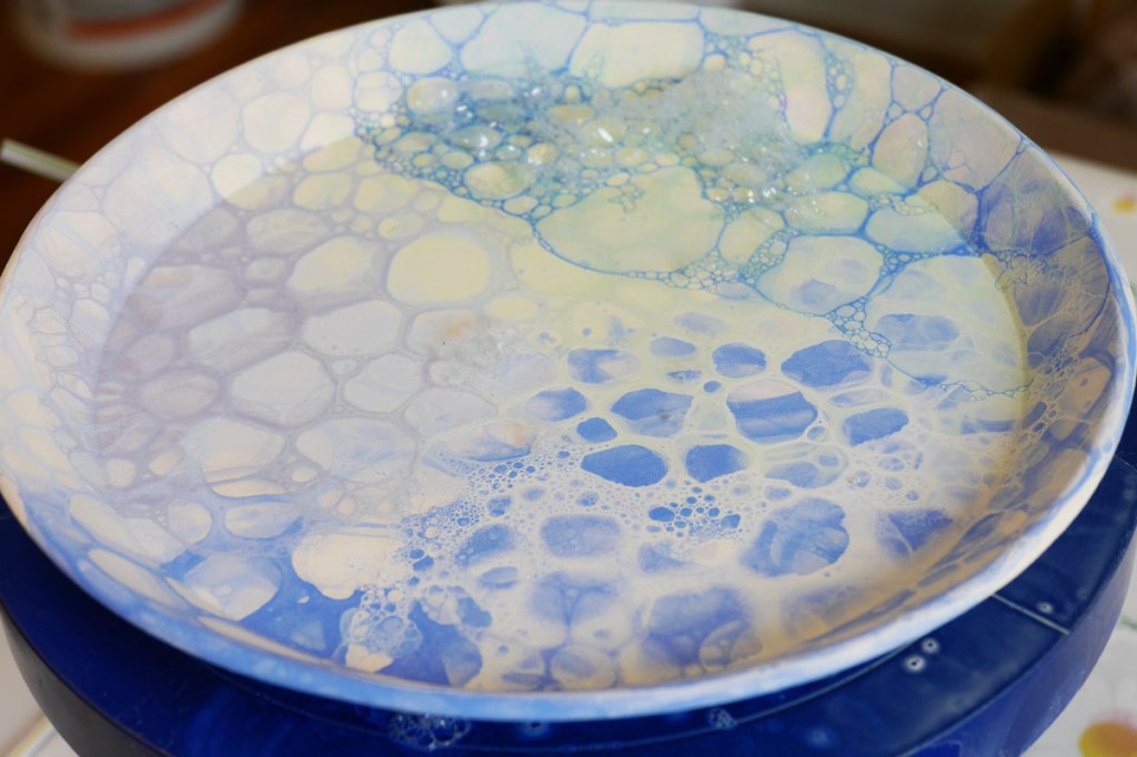 - Mix underglaze with a bit of water and a few drops of Dawn dishwashing liquid. Experiment to get the size bubble and color intensity you want. (For darker colors, use less water and more soap in your mixture.) Test on a paper towel.