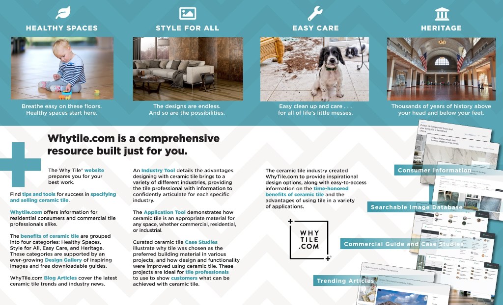 A brochure for an online product? Yes, WhyTile.com creates information for an association of partners to use as their own products. I designed this brochure to be used as a trade show and conference collateral piece explaining the benefits of being a Why Tile partner.