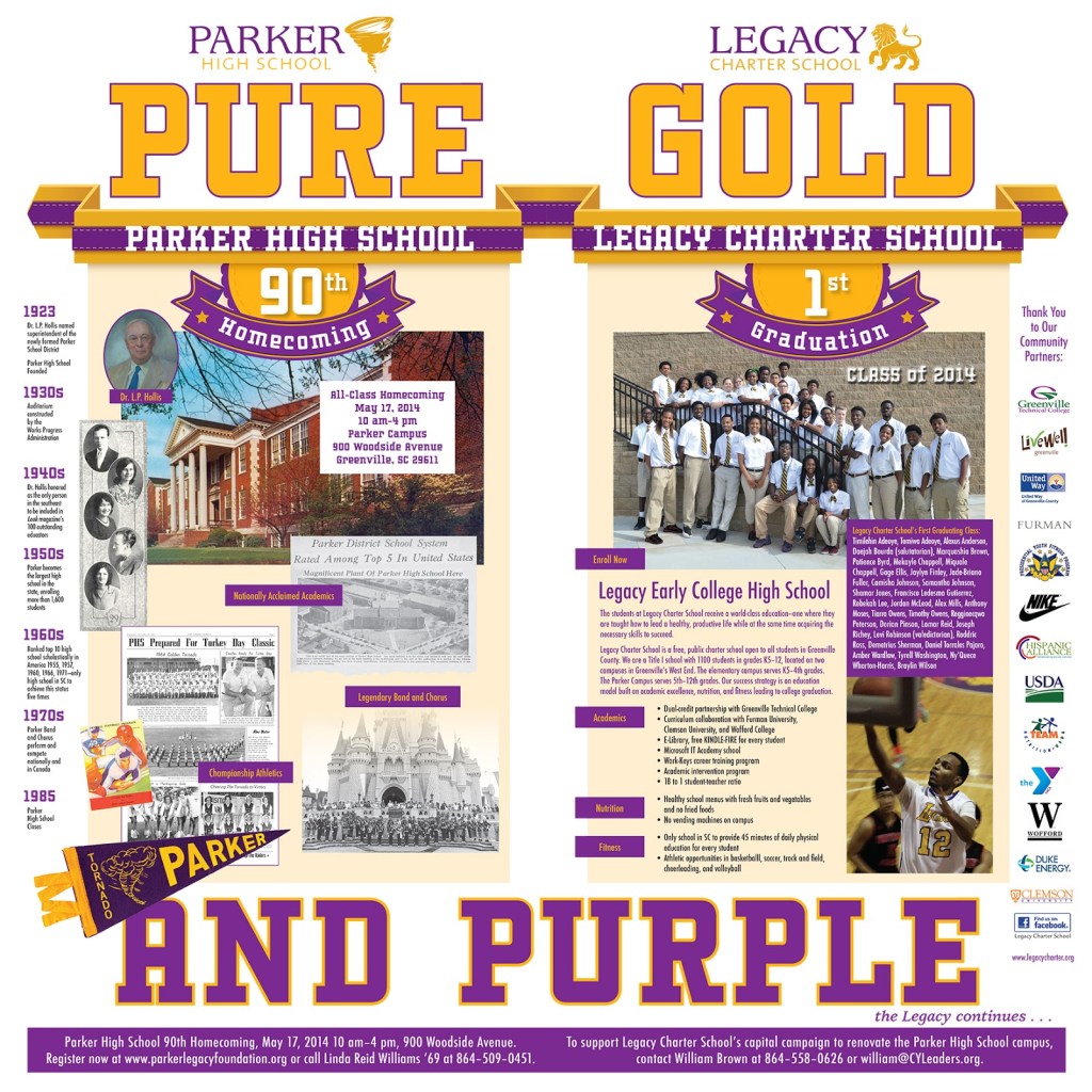 I had the opportunity to ghost write OpEds and create unique content such as this double-truck newspaper ad. This ad celebrated the charter school’s first graduating class, which coincided with the 90th anniversary of the first graduating class that originally occupied the campus of the charter school. I researched these facts, gathered the visuals, created the graphics, designed the piece, and even bought the ad space. Legacy honored the heritage of Parker by adopting the school’s colors of gold and purple.