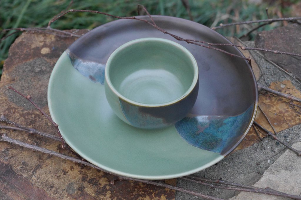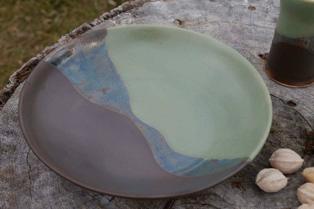 Combining glazes by overlapping layers can create unique effects. The combo of Mayco’s Green Tea over and Black Walnut creates a mirror-like finish with blooms of blue and hints of plum.