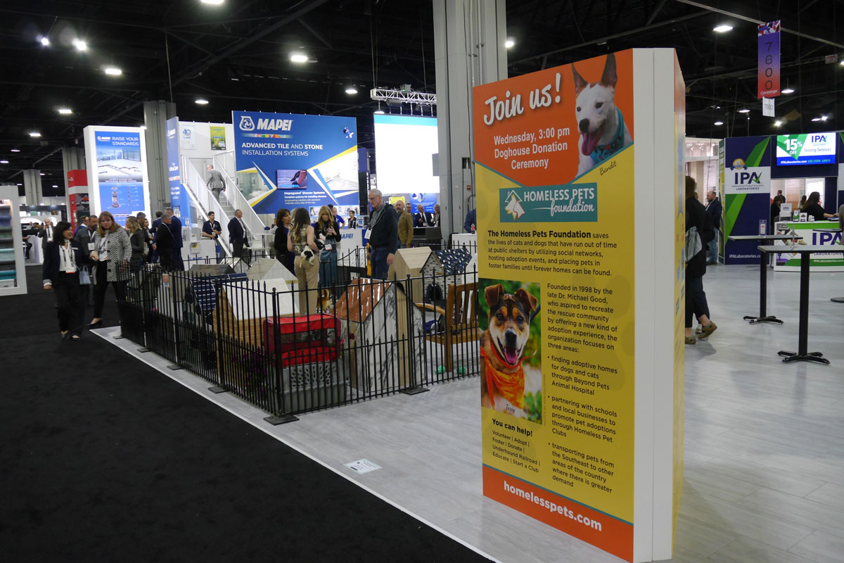 Each year at Coverings, the largest ceramic tile and stone trade show in North America, the Tile Council of North America (TCNA) partners with manufacturers to create and exhibit tiled doghouses. The doghouses are donated to a local pet charity after the show and the charities use the doghouses to raise funds. The doghouses are included in TCNA’s show booth and the charities bring adorable (and energetic) adoptable dogs to the show floor. This area has grown very popular over the years as a fun respite for tired exhibitors and attendees alike. I enjoy creating the graphics for this event every year.