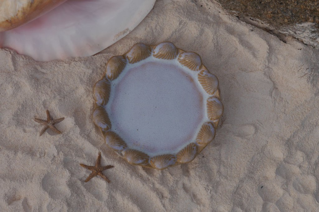 One of the first things I worked on with clay was making sprig molds of my Mom’s seashell collection. I didn’t know quite what I wanted to do with them and they sat unused for many months. It was a long holiday weekend when I made a number of push plates and adorned them with shells sprigs . . . just whatever came to mind.